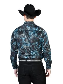 Camisa Vaquera Manga Larga Estampada Floral Azul Rey Para Mujer ‘El Señor De Los Cielos’ – ID: 43895
