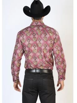 Camisa Vaquera Manga Larga Estampada Vino Oscuro Para Hombre ‘El Señor De Los Cielos’ – ID: 43585