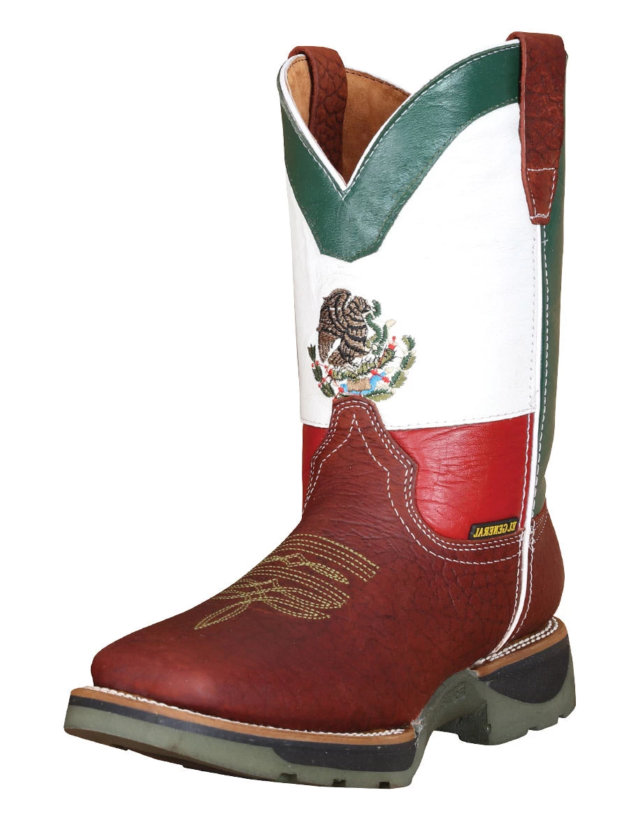 - Men’s Genuine Leather Western Mexican Flag Pull-On Soft Toe Work Boots ‘El General’