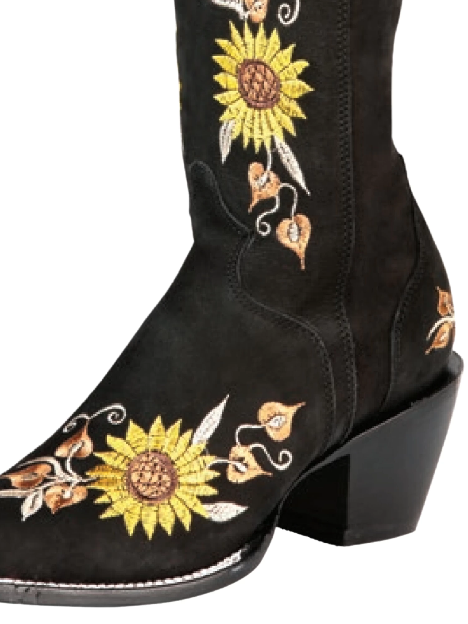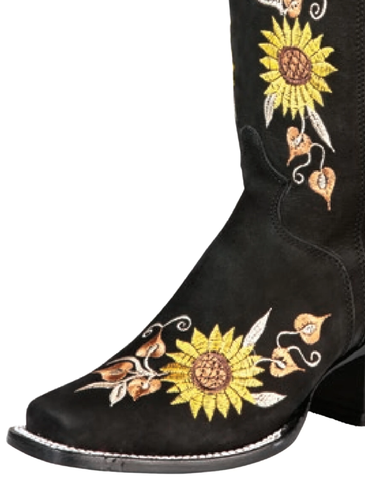 - Women’s Nubuck Leather Sunflowers Embroidered Tall Shaft Western Cowgirl Boots ‘El General’