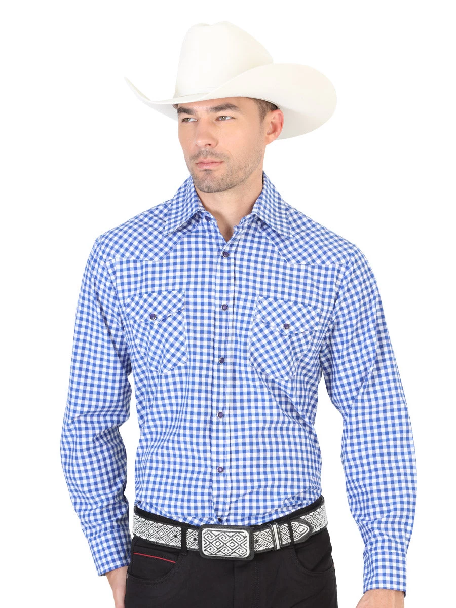 - Men’s Dark Blue Plaid Print Pockets Long Sleeve Western Shirt ‘El Señor de los Cielos’