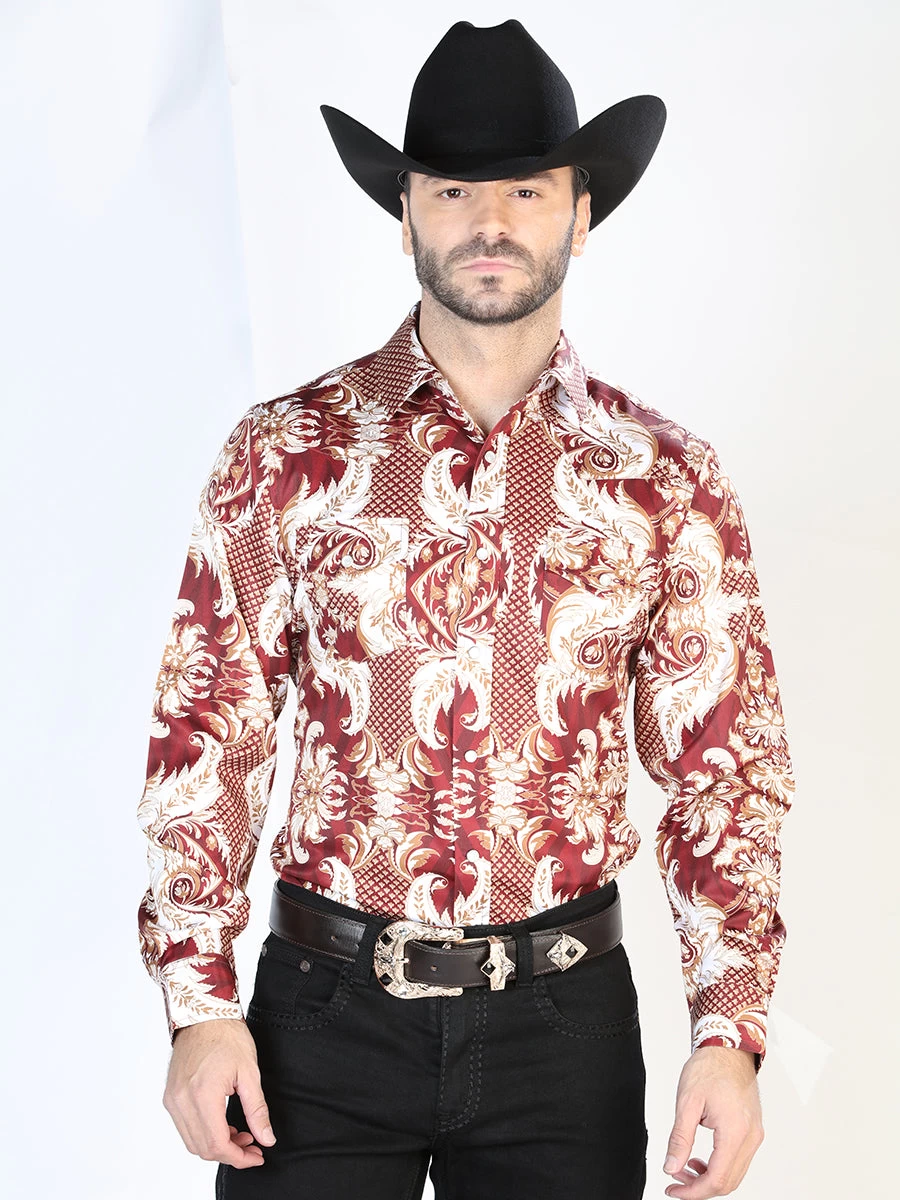 - Men’s Burgandy/Gold Print Long Sleeve Snap Western Shirt ‘El Señor de los Cielos’