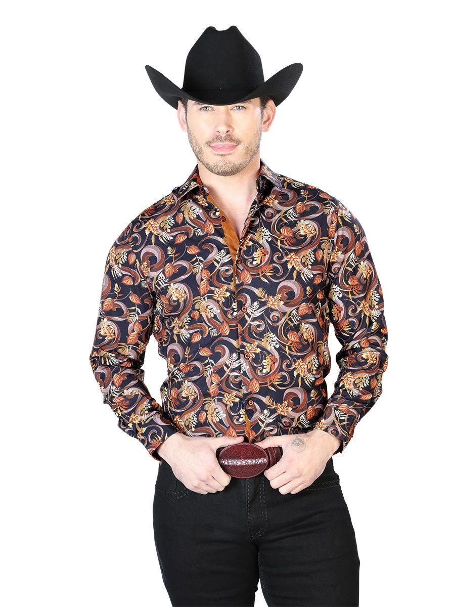 - Men’s Black/Gold Leaves Print Long Sleeve Western Shirt ‘El Señor de los Cielos’