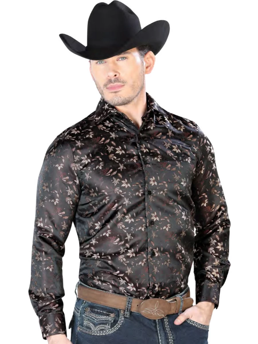 - Men’s Brown Floral Print Long Sleeve Jacquard Western Shirt ‘Centenario’