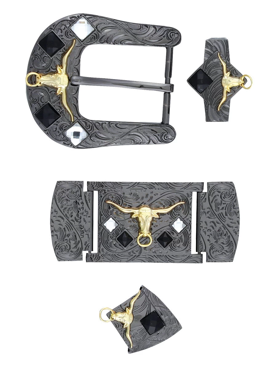 - Engraved Smoked Metal Black/White Crystal-Bull Ornament 6-Pc Set 1 1/2″ Western Belt Buckle ‘El General’