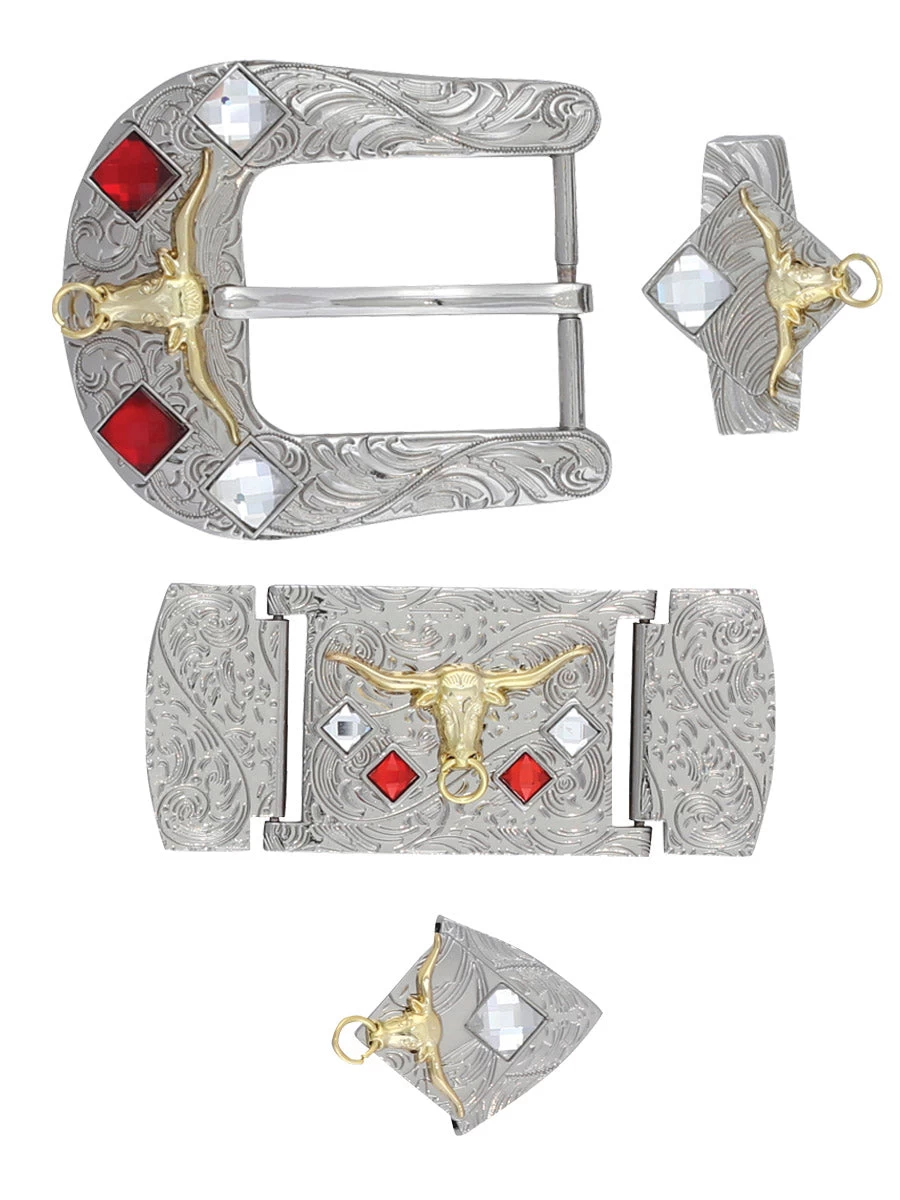 - Engraved Silver Metal Red/White Crystal-Bull Ornament 6-Pc Set 1 1/2″ Western Belt Buckle ‘El General’